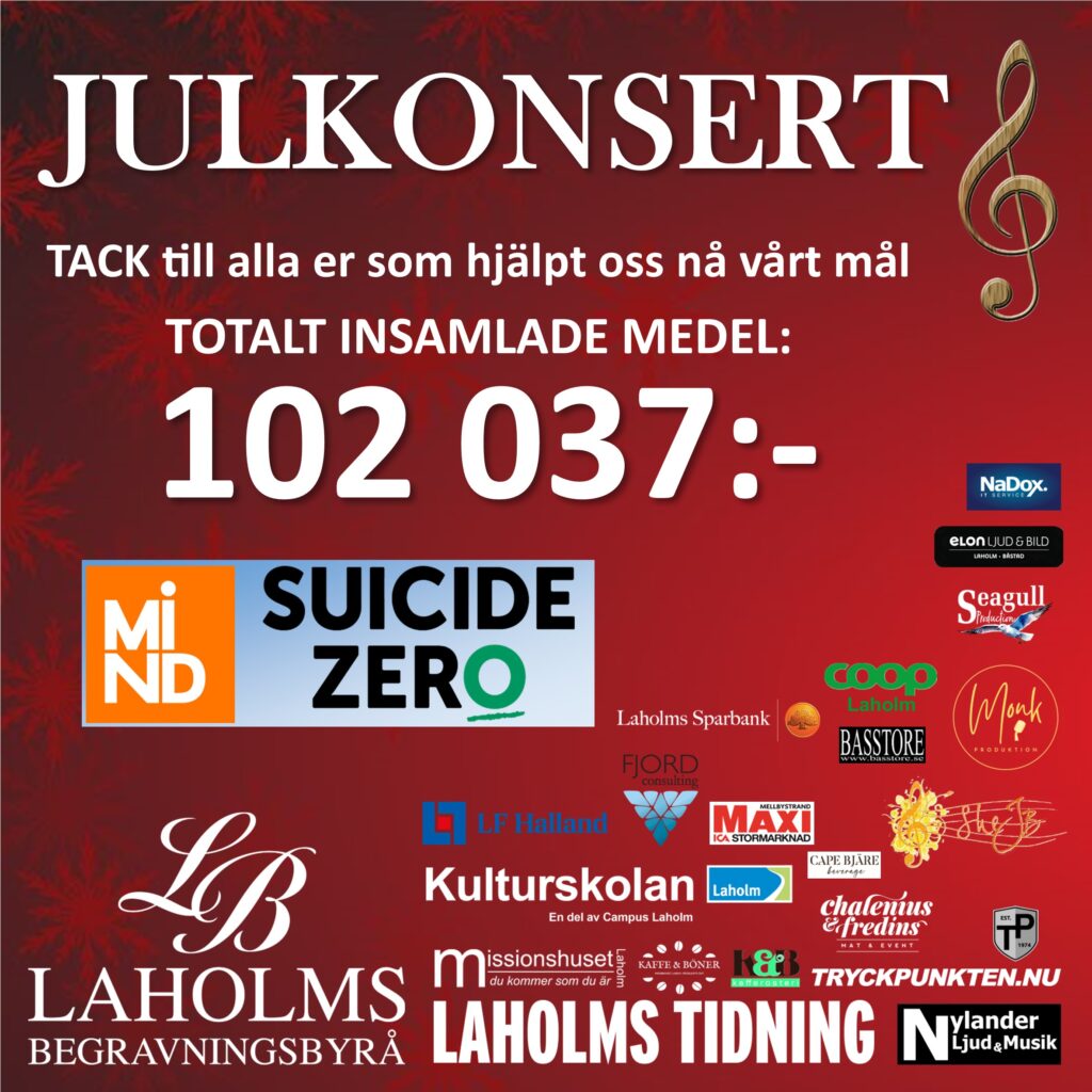 Och söndag den 15 december slog vi upp dörrarna till Osbecksgymnasiets aula där ca 300 personer köpt biljett för att lyssna på alla frivilliga artister som ställt sig på scenen. När vi summerade denna konsert med alla kringarrangemang som fikaförsäljning mm så landade vi på en summa av 102.000:- som gick oavkortat till organisationerna Mind och Suicid Zero.